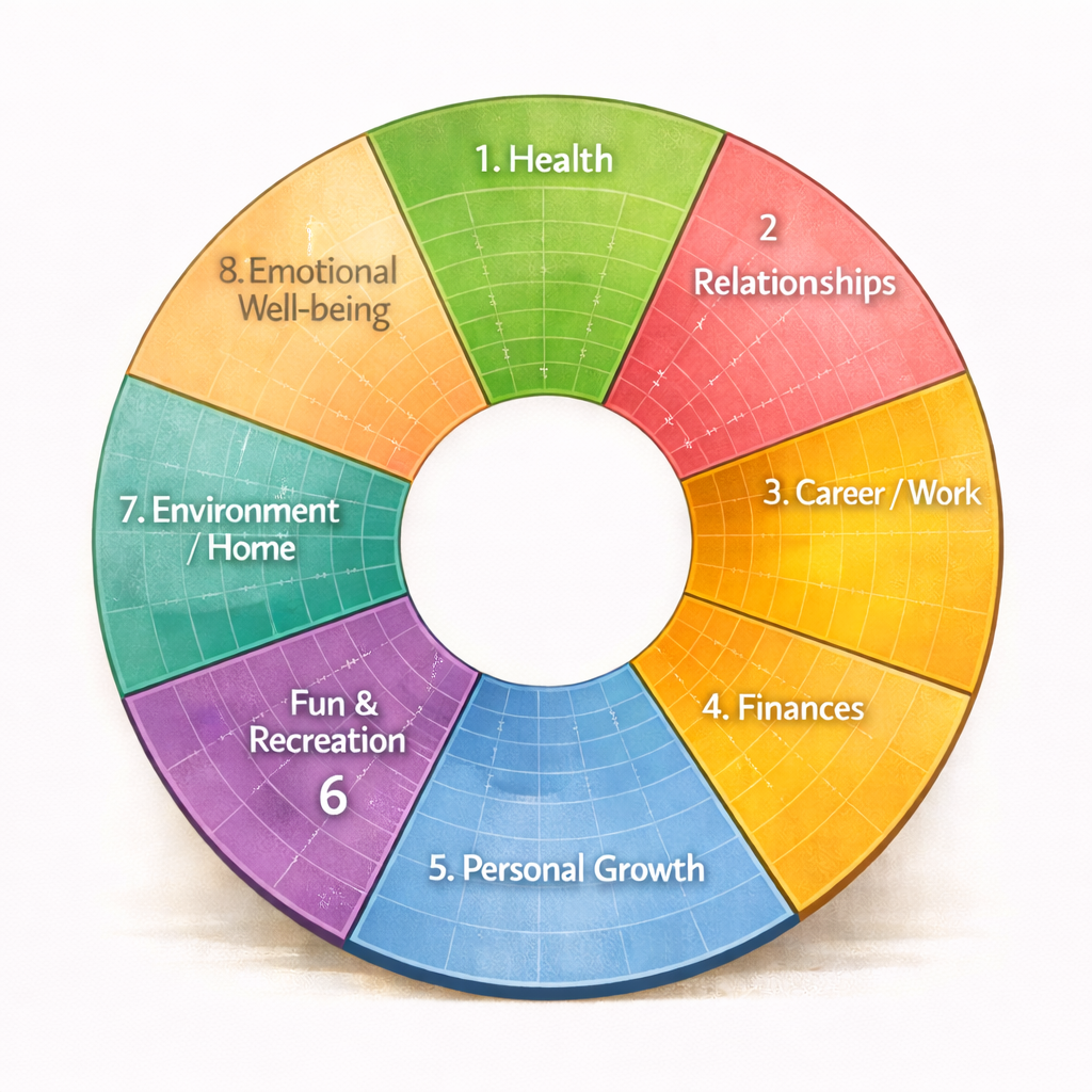 The Wheel of Life – A Simple Reality Check This wheel represents 8 key areas of your life: 1. Health, 2. Relationships, 3. Career/Work, 4.Finances, 5. Personal Growth, 6. Fun & Recreation, 7. Environment/Home, and 8. Emotional Well-being. Rate each area from 1 to 10 based on where you honestly feel you are today. When all areas are balanced, the wheel is round—and life moves forward smoothly. But when some areas are low, the wheel becomes uneven. Just like a car with a damaged wheel, life starts to feel bumpy, exhausting, and out of control. This exercise helps you see clearly where you are now, where you feel stuck, and what needs attention first—so you can move forward with clarity instead of stress.
